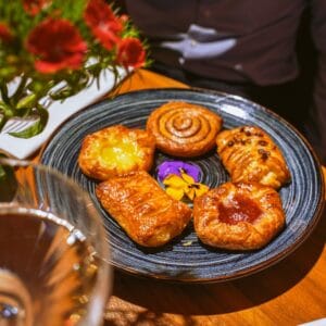The Valentine’s brunch consists of four courses served as shared dining, with the menu displayed alongside. We begin on a festive note with a glass of champagne, followed by the first three courses accompanied by a glass of prosecco or a mimosa (non-alcoholic options available). The brunch concludes with a sweet finale, served with coffee or tea.